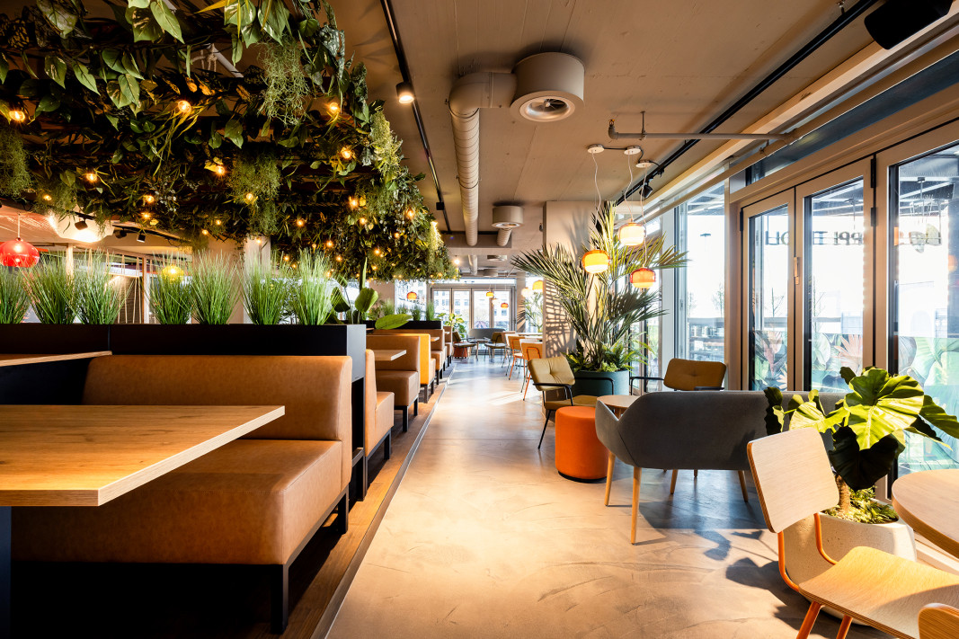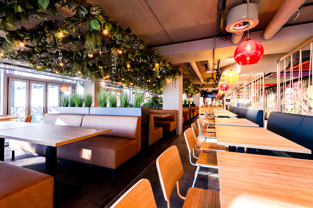Realisation Innenausbau, Wandgestaltungen, Oberflächen, Wandbild, Ausgabe Streetfood Market, Raumtrenner Paletten